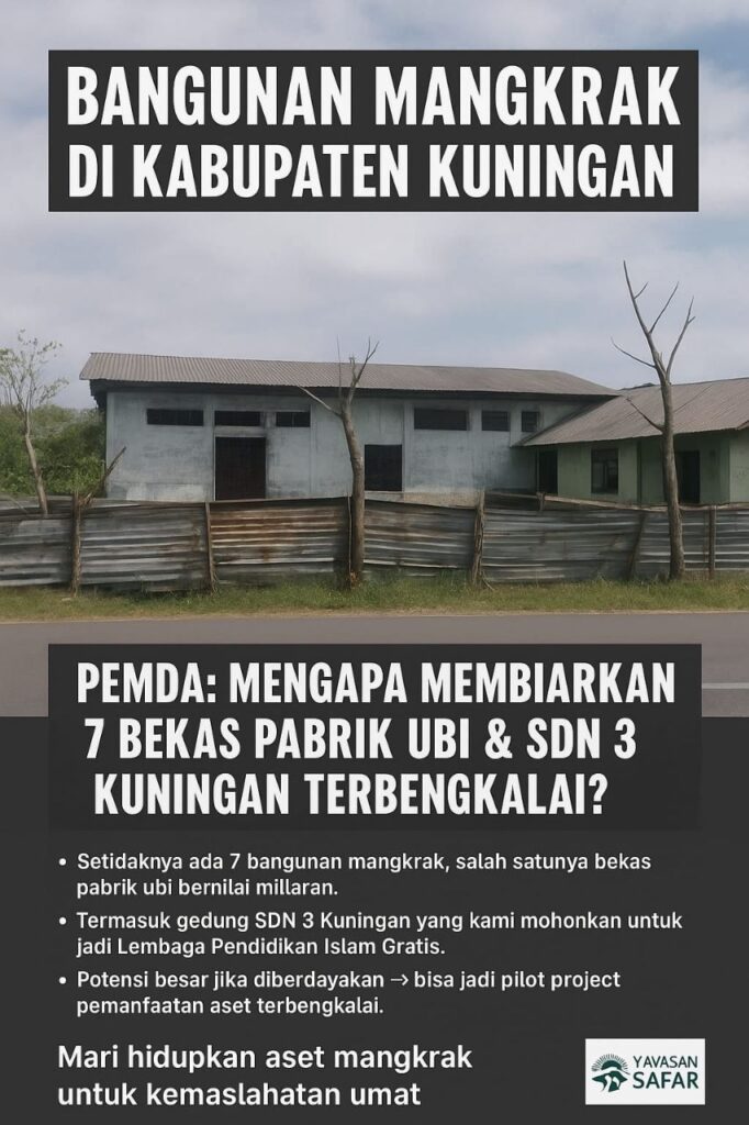 Gedung SDN 3 Kuningan terbengkalai sejak pandemi Covid-19. Sejak 20 Agustus 2025, Yayasan SAFAR (Sang Fajar Rabbani) telah resmi mengajukan permohonan pemanfaatan gedung ini untuk dijadikan Lembaga Pendidikan Islam Non-Komersial, demi kepentingan masyarakat dan generasi penerus bangsa. Namun hingga kini, belum ada respons dari pihak berwenang.Β πŸ‘‰Β Saatnya bertindak SEKARANG! Jangan biarkan gedung pendidikan mangkrak, sementara kebutuhan masyarakat akan pendidikan semakin mendesak. Yayasan SAFAR Jl. Siliwangi Cigembang, Kuningan 45512