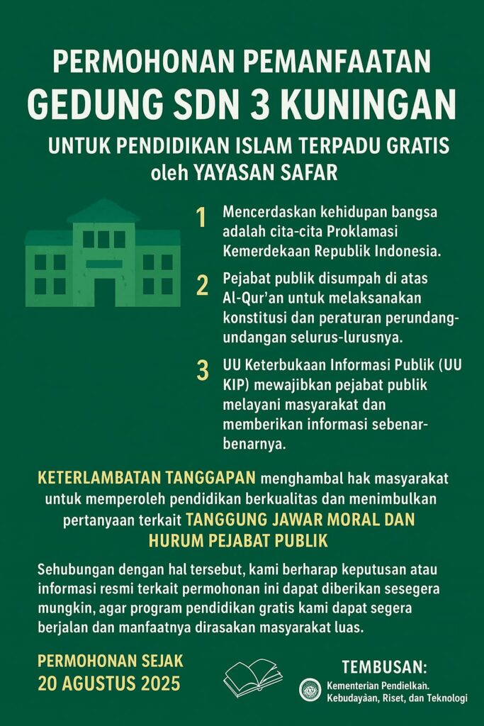 Kami dari Yayasan SAFAR (Sang Fajar Rabbani), yang Insya Allah bergerak dalam bidang Lembaga Pendidikan Islam Terpadu GRATIS, mengajukan permohonan memanfaatkan bekas gedung SDN 3 Kuningan yang terbengkalai sejak pandemi COVID-19. Permohonan resmi kami telah diajukan sejak 20 Agustus 2025, namun hingga kini belum ada tanggapan.